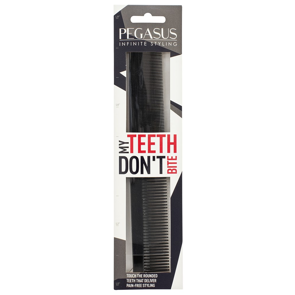 Storming Europe and the USA, Pegasus combs redefine styling. Combined with revolutionary Flexinite technology, Pegasus 210 Cutting Comb Large is styling at its best. Flexinite Smart Comb Technology creates seamless teeth which are sensitive to changing temperatures, mimicking hair and flexibly moving in response to heat and chemicals. The result? No damage to hair. Pegasus 210 Cutting Comb Large is ideal for cutting, barbering purposes, scissor over comb and edges. Two widths of teeth for different hair thickness.
