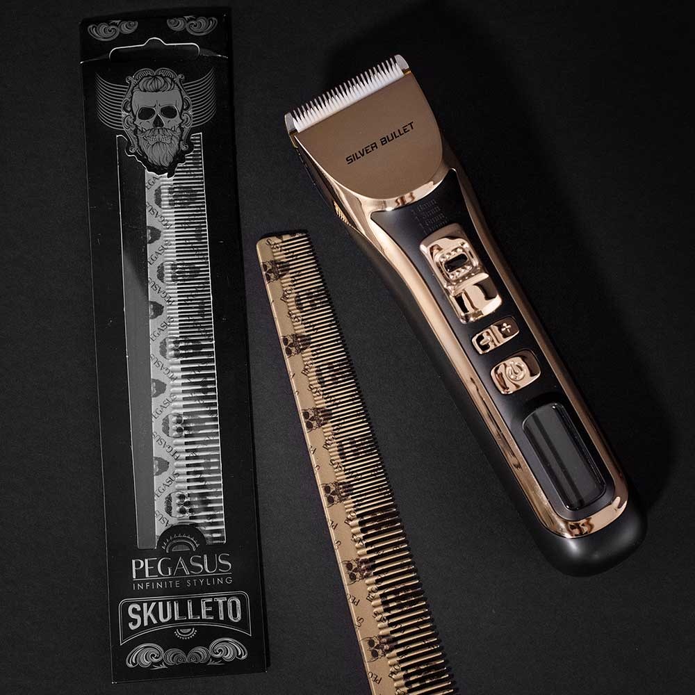 The combs which redefined styling. Pegasus Skulleto 303 Barber Tapered Comb in Gold is styling at its coolest. With signature skull print in gold, this comb features Flexinite Smart Comb Technology for seamless teeth which won’t damage hair. Ideal for cutting, barbering, scissor over comb and edges. Two widths of teeth for different hair thicknesses.