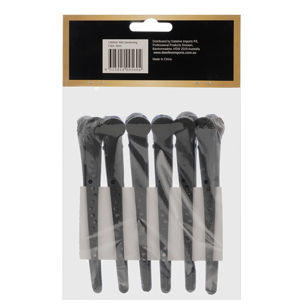 Premium Pin Company 999 Black Sectioning Clips 6pk are professional jumbo sized, slim clips which are great for holding sections of hair during cutting, colouring or styling. The extra strong grip is designed to hold large amounts of hair securely and prevent fine hair from sliding out - ideal for all hair types and textures. Crafted from high-quality materials, these sleek black clips are lightweight yet sturdy, allowing for all-day use without discomfort. The spring mechanism ensures consistent tension, while the smooth edges prevent hair breakage. Achieve salon-quality styling with the Premium Pin Company 999.