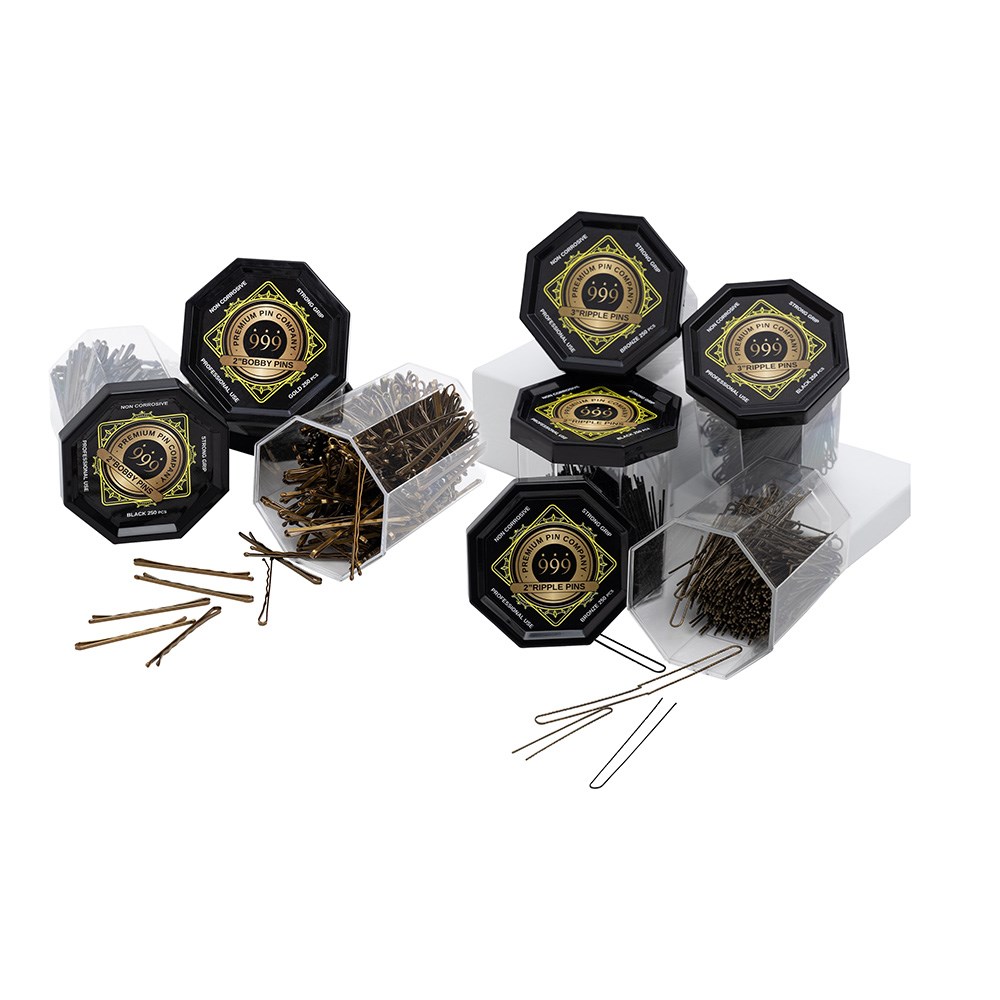 Premium Pin Company 999 Ripple Pins 3” Black 250pc are expertly designed to meet the demands of hairdressing professionals and enthusiasts alike. Crafted with a unique "U" shaped thin wave design that effortlessly holds hair in place, discreetly enhancing your hairstyle. The long-lasting, durable design and rust-resistant materials make these ripple pins a reliable choice for your hairstyling needs. Convenience is key, which is why our ripple pins are housed in an easy-to-use see-through dispenser. No more fumbling through drawers struggling to find the right pin. Our dispenser keeps your pins organised and within reach, making hairstyling effortless. Choose Premium Pin Company 999 for superior quality and performance.