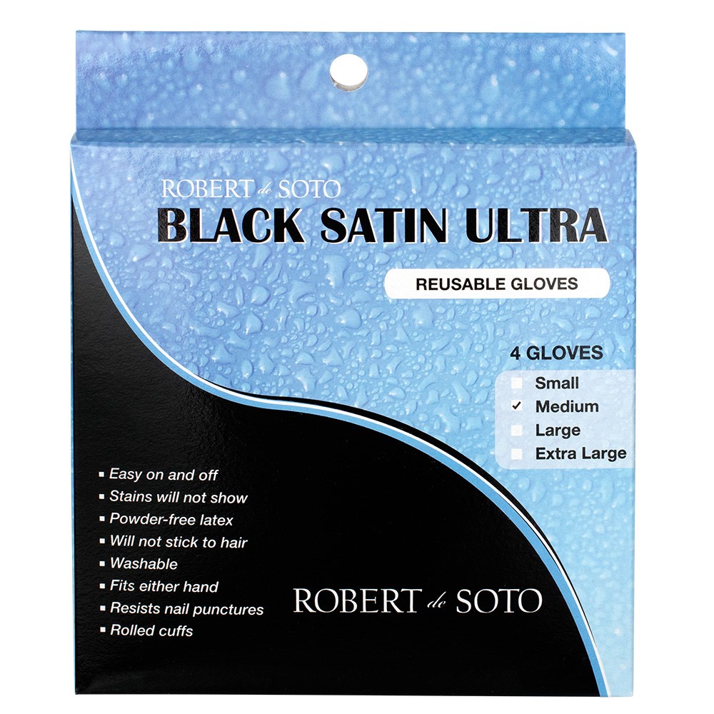 Carefree and stain-free! Easy on and easy off, Robert de Soto Black Satin Reusable Gloves are made from powder-free natural latex to protect your hands from colour stains. These comfortable, reusable gloves won’t pull or stick to the hair, and are resistant to nail punctures. Designed to fit either hand, these washable gloves are available in a pack of 4. Size: Medium.