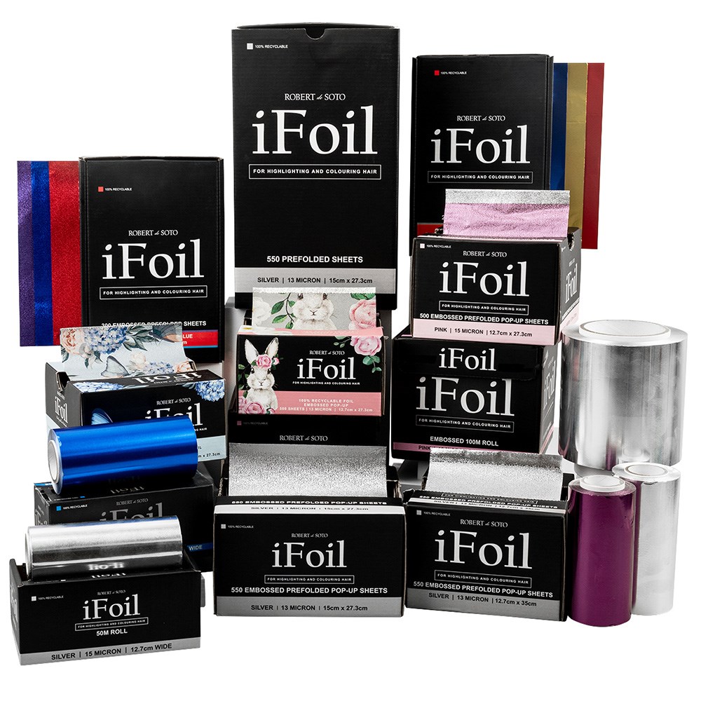 Fast and easy foil with embossing! Robert de Soto makes hairdressing foil super convenient with iFoil Embossed Pop Up 13 Micron Extra Wide Silver. This extra wide foil is great for all foiling work in the salon environment. Pre-folded sheets save precious time – simply grab a foil and get going! Foils won’t stick together or bend out of shape. Embossing on the foils grips the hair better than traditional foil, ensuring no slippage. 550 pre-folded, pop-up sheets. 100% recyclable. 13 microns and 20cm x 40cm in size.