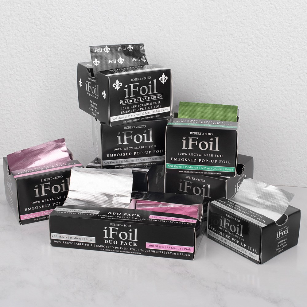 Fast and easy foil with embossing! Robert de Soto makes foil super convenient with iFoil Embossed Pop Up 13 Micron in Silver. This standard-sized foil is great for all foiling work in the salon environment. Pre-folded sheets save precious time – simply grab a foil and get going! Foils won’t stick together or bend out of shape. Embossing on the foils grips the hair better than traditional foil, ensuring no slippage. 550 pre-folded, pop-up sheets. 100% recyclable. 13 microns and 12.7cm W x 27.3cm L in size.