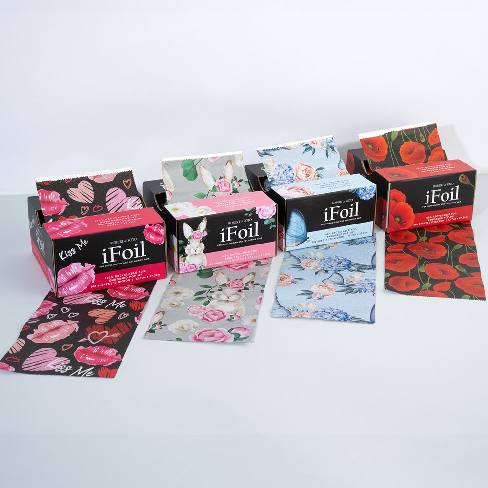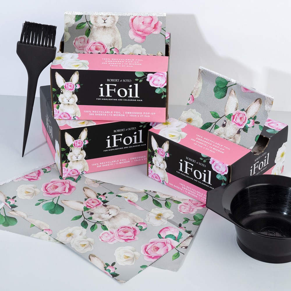 Add a little fun to your salon style! Great for all colouring services, this patterned Robert de Soto iFoil Embossed Pop Up Bunny in Large is foil with flair. With 100% recyclable foil , each box contains a generous 500 sheets and features a small push-up action underneath for convenience when foil is running low. No cutting, no hassle – each large sized sheet measures 15cm x 27.3cm, giving you extra space for certain colouring services. The easy pop-up dispenser makes life easier, while the embossed foil’s much needed grip prevents slippage.