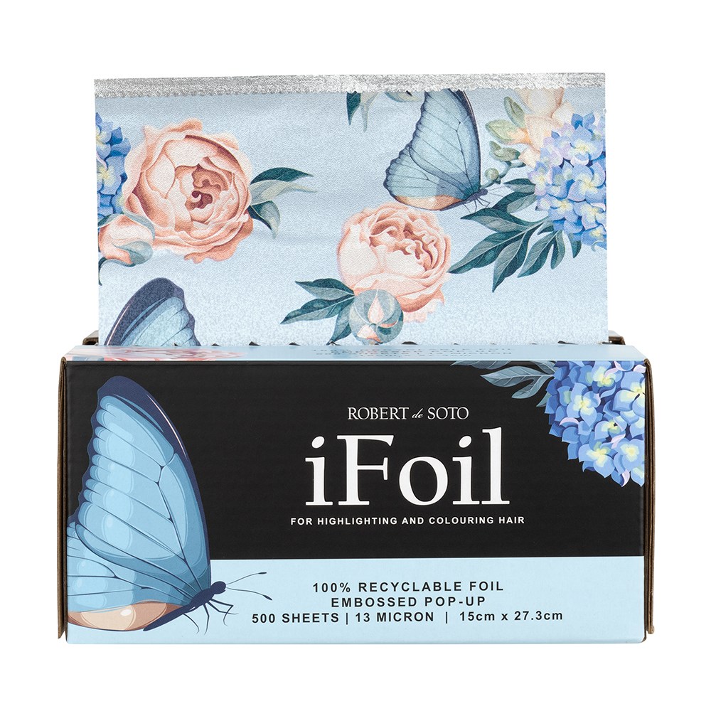 Add a little fun to your salon style! Great for all colouring services, this patterned Robert de Soto iFoil Embossed Pop Up Butterfly in Large is foil with flair. With 100% recyclable foil, each box contains a generous 500 sheets and features a small push-up action underneath for convenience when foil is running low. No cutting, no hassle – each large sized sheet measures 15cm x 27.3cm, giving you extra space for certain colouring services. The easy pop-up dispenser makes life easier, while the embossed foil’s much needed grip prevents slippage.