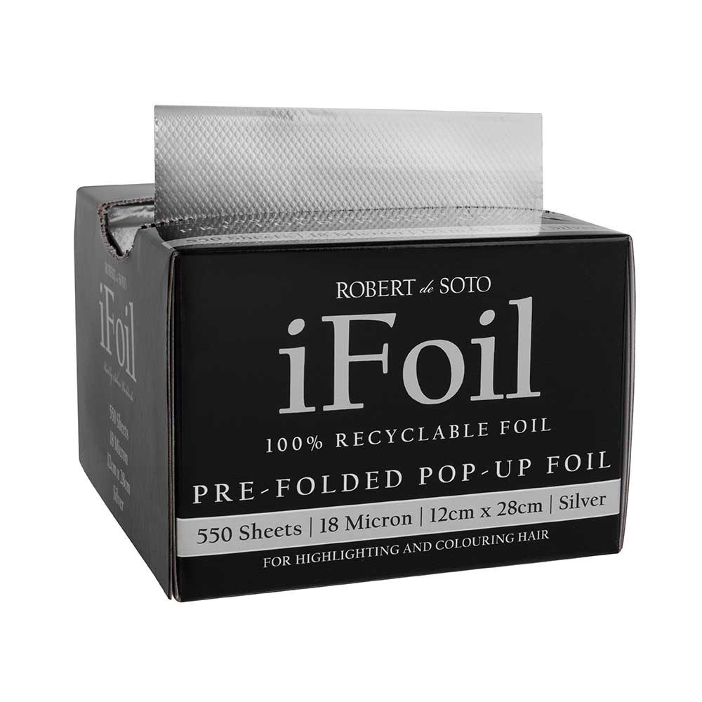 Fast and easy pre-folded hairdressing foil. Robert de Soto makes foil super convenient with his iFoil Pre-Folded Pop-Up in Silver 18 Micron. This 100% recyclable foil is all about ensuring colouring and highlighting is easy and efficient. The convenient tissue box style dispenser contains 550 pre-folded sheets of 18 microns each, designed to simply pop up. No cutting, no hassle!