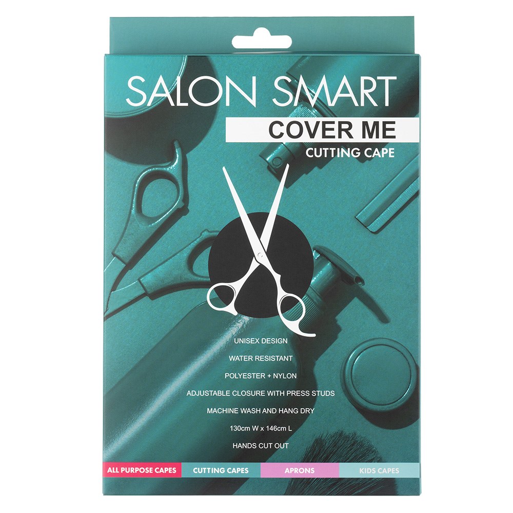 The smart (and stylish!) choice for capes. Salon Smart Cover Me Cutting Cape is a water resistant, polyester and nylon cape which keeps clients comfortably protected. This lightweight, unisex design features an adjustable closure with press studs and convenient hands cut out for easy movement for client. Generous size which suits all. Machine washable.