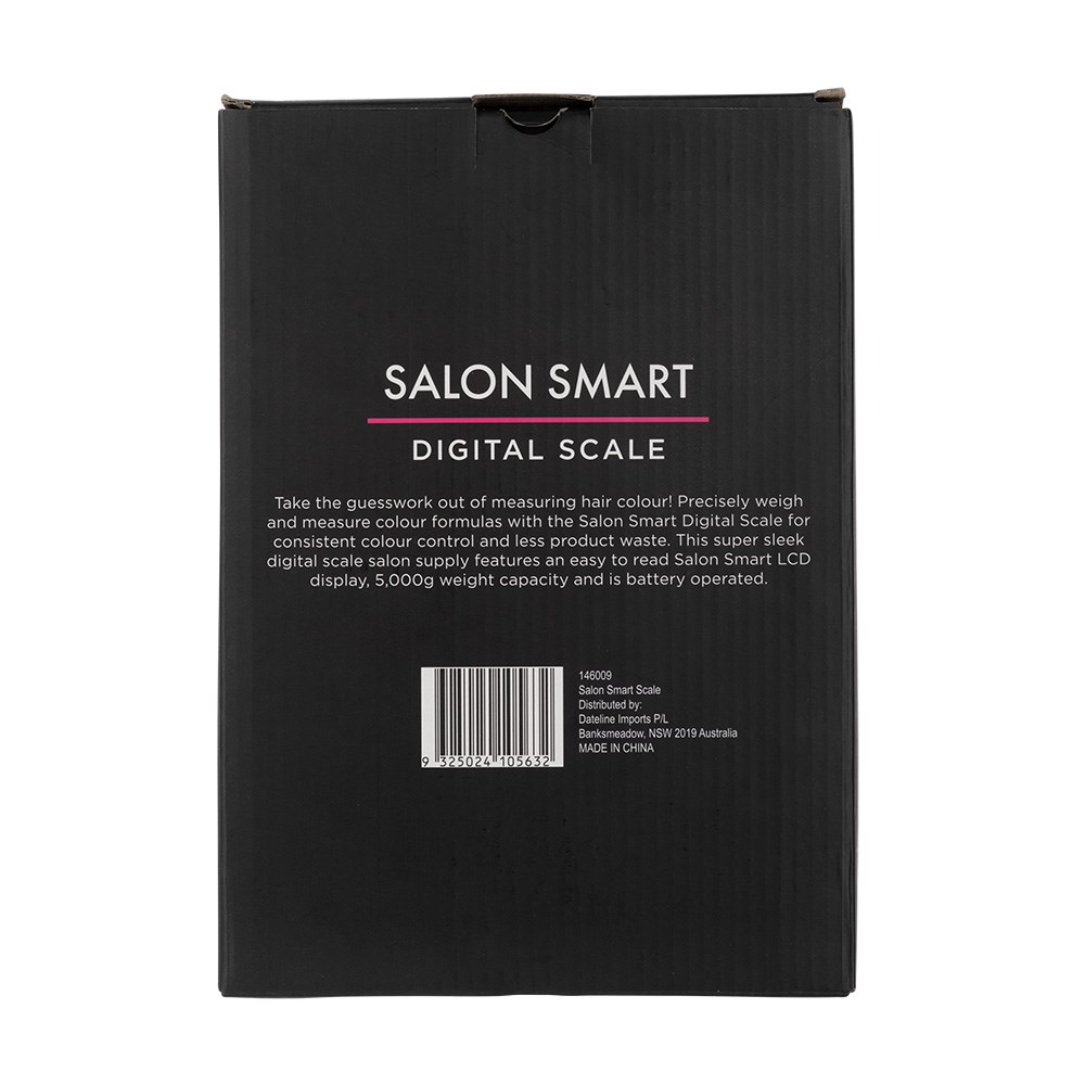 No more guesswork. Precisely weigh and measure colour formulas with Salon Smart Digital Scale Black. Consistent colour control and less product waste. This sleek digital scale features an easy-to-read LCD display and 5000g weight capacity. Battery operated.
