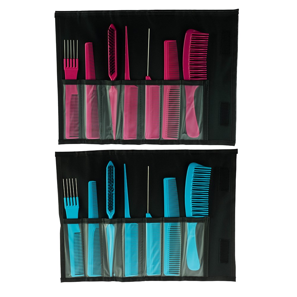 The Salon Smart Folding Comb Set displays an array of seven colourful hairstyling tools for all your styling needs. You’ll never be short of a comb again! Housed in a black pouch which folds away for easy storage, the set includes a styling/cutting comb, sectioning comb, plastic comb for colouring, lifting comb, teasing brush and detangling comb.