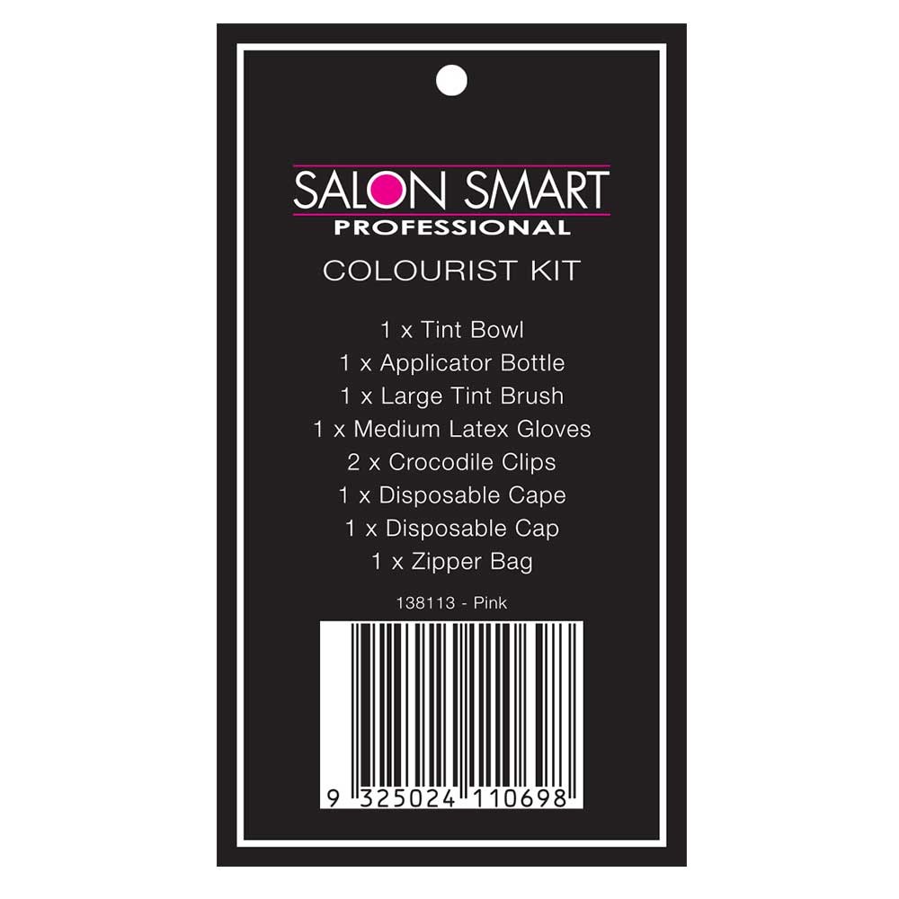 One kit, all the colour essentials. Salon Smart Colourist Kit Pink is an 8 piece collection of convenient, portable colouring accessory must-haves. An ideal kit for at-home colouring or for hairdressers on-the-move, Salon Smart Colourist Kit Pink contains a tint bowl, large tint brush, applicator bottle, medium latex gloves, crocodile clips, disposable cape, disposable cap and zippered bag.