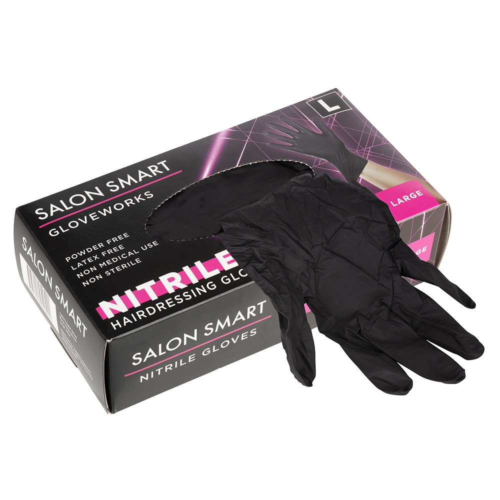 Salon Smart Nitrile Gloves Black Large 100pk offer superior puncture resistance. No more fears of tearing or ripping your gloves when you use Salon Smart Nitrile Gloves! Gloves are powder-free and textured, as well as latex-free and suitable for those with latex allergies. Perfect for non-medical, salon use.