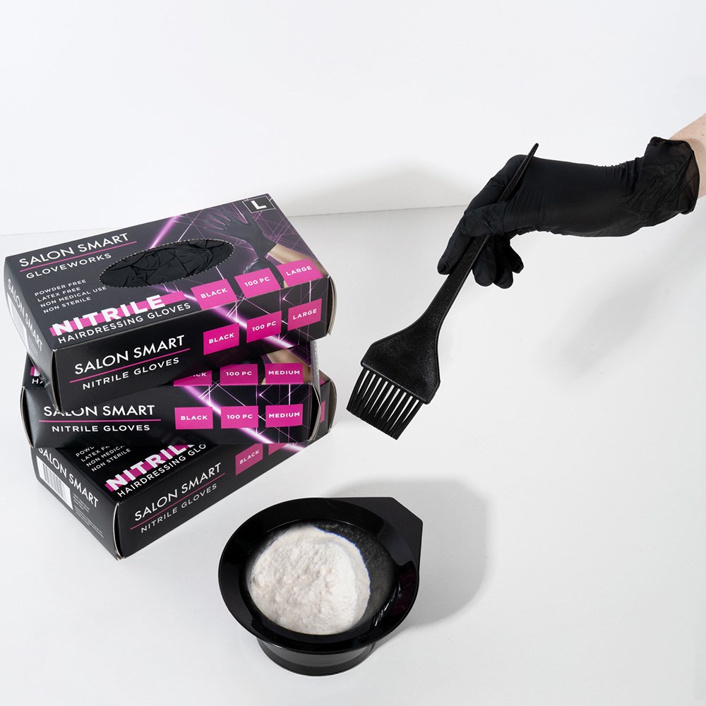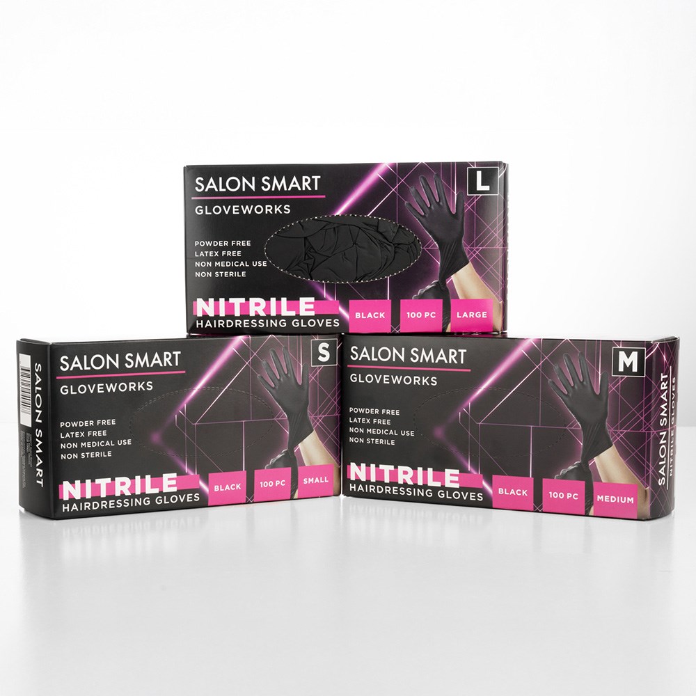 Salon Smart Nitrile Gloves Black Medium 100pk offer superior puncture resistance. No more fears of tearing or ripping your gloves when you use Salon Smart Nitrile Gloves! Gloves are powder-free and textured, as well as latex-free and suitable for those with latex allergies. Perfect for non-medical, salon use.