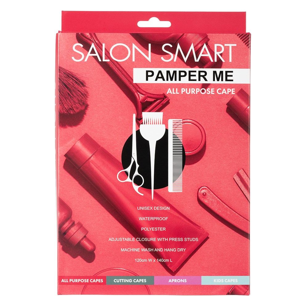 Protection in style. Salon Smart Pamper Me All Purpose Cape is a waterproof, 100% polyester cape which keeps clients comfortably protected. This lightweight, unisex design features an adjustable closure with press studs. Generous size which suits all. Machine washable.