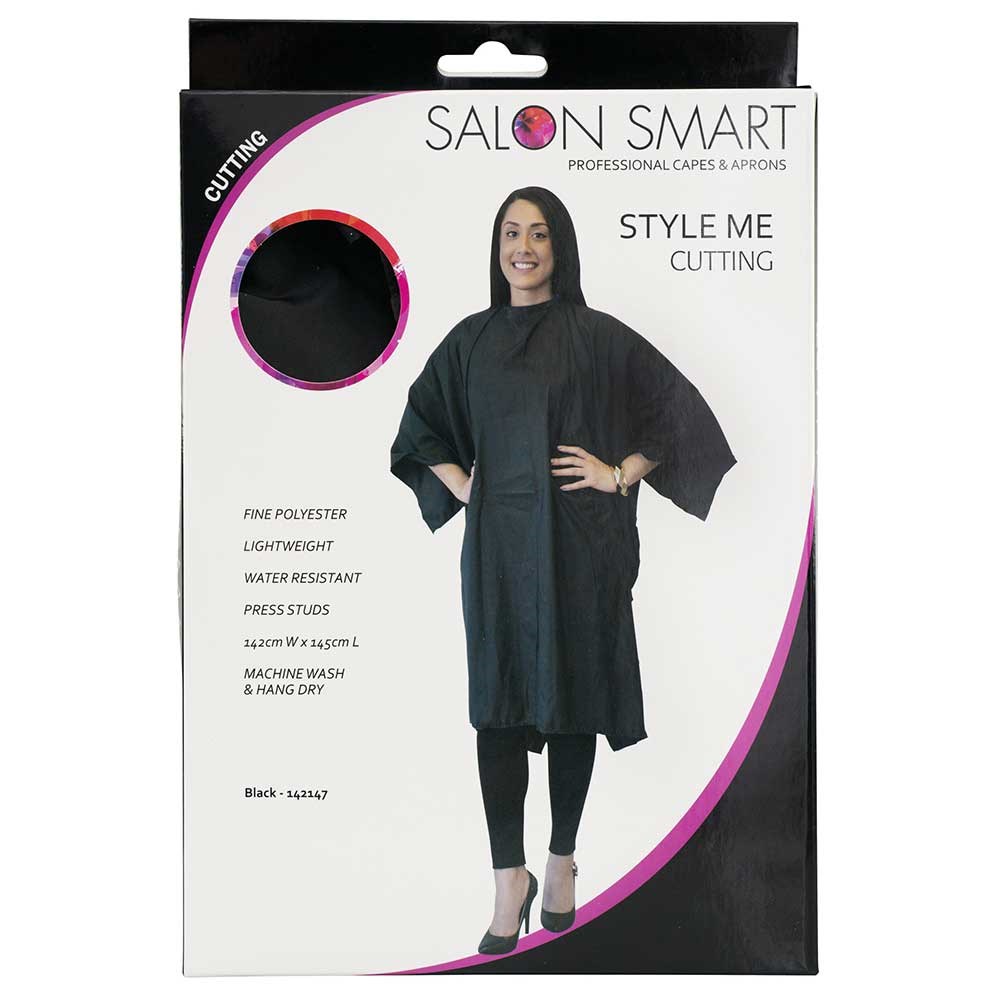 The Salon Smart Style Me Cutting Cape Black is made from water resistant fine polyester for maximum client protection. The lightweight cape comes with press studs that ensure a comfortable fit for all clients. Large cape size in black that will suit any salon environment. Ideal for haircutting, colouring and styling.