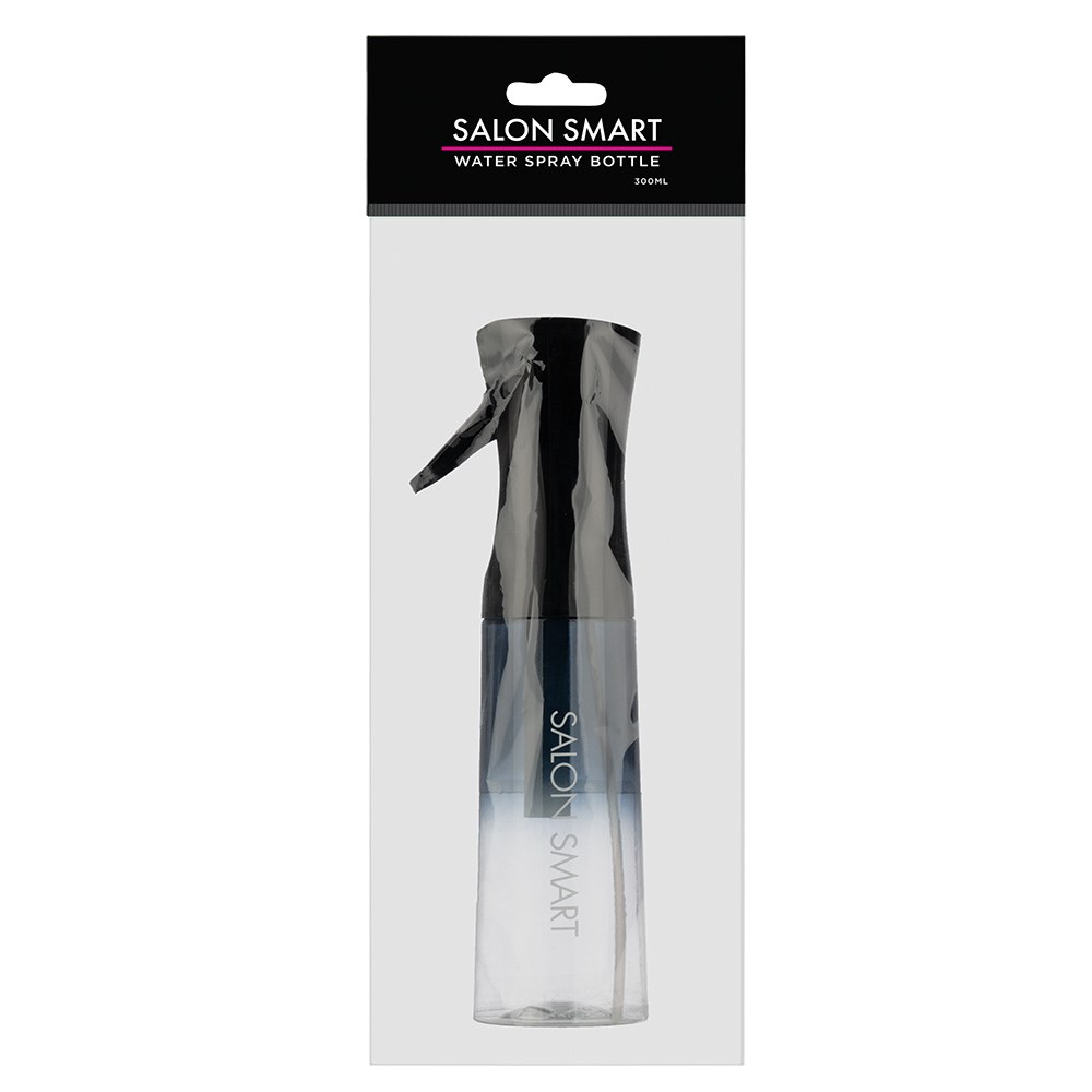 Salon Smart Water Spray Bottle 300ml is the smart choice. In chic ombre black with Salon Smart logo, this sleek bottle fits perfectly in your hand. The adjustable spray nozzle is designed to maximise efficiency and accuracy. With a 300ml capacity, this spray is ready when you are.
