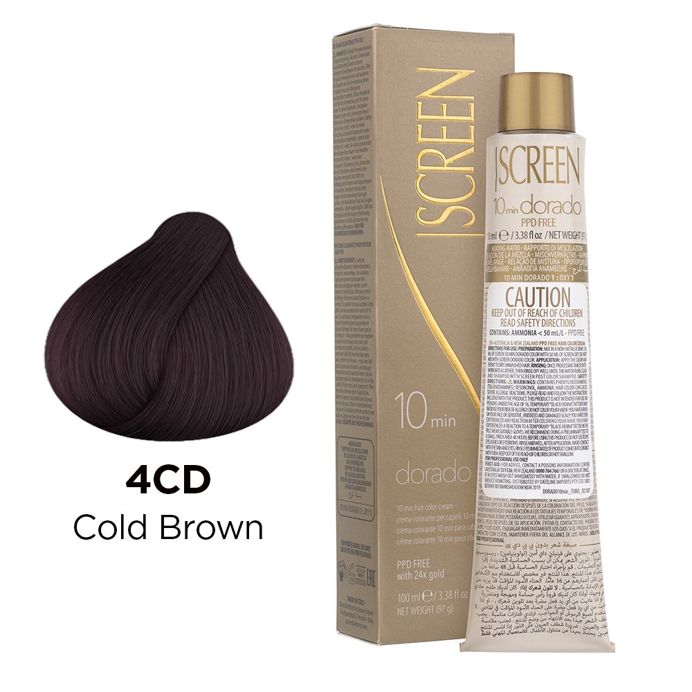 Ultra-fast, efficient and high performance, Screen 10 Min Dorado Hair Colour Cream 4CD Cold Brown is a salon dream. With only 10 minutes processing time, this PPD-free and paraben-free colouring cream is ideal for root touch-ups, grey coverage and male clients desiring colour blending. Enriched with 24K gold for incredible light-reflecting results, vibrant shine and rich vibrancy. Maximum grey coverage and uniform, long-lasting results. Only 10 minutes to incredible colour with superb tonal richness! Elite colour created in Italy.