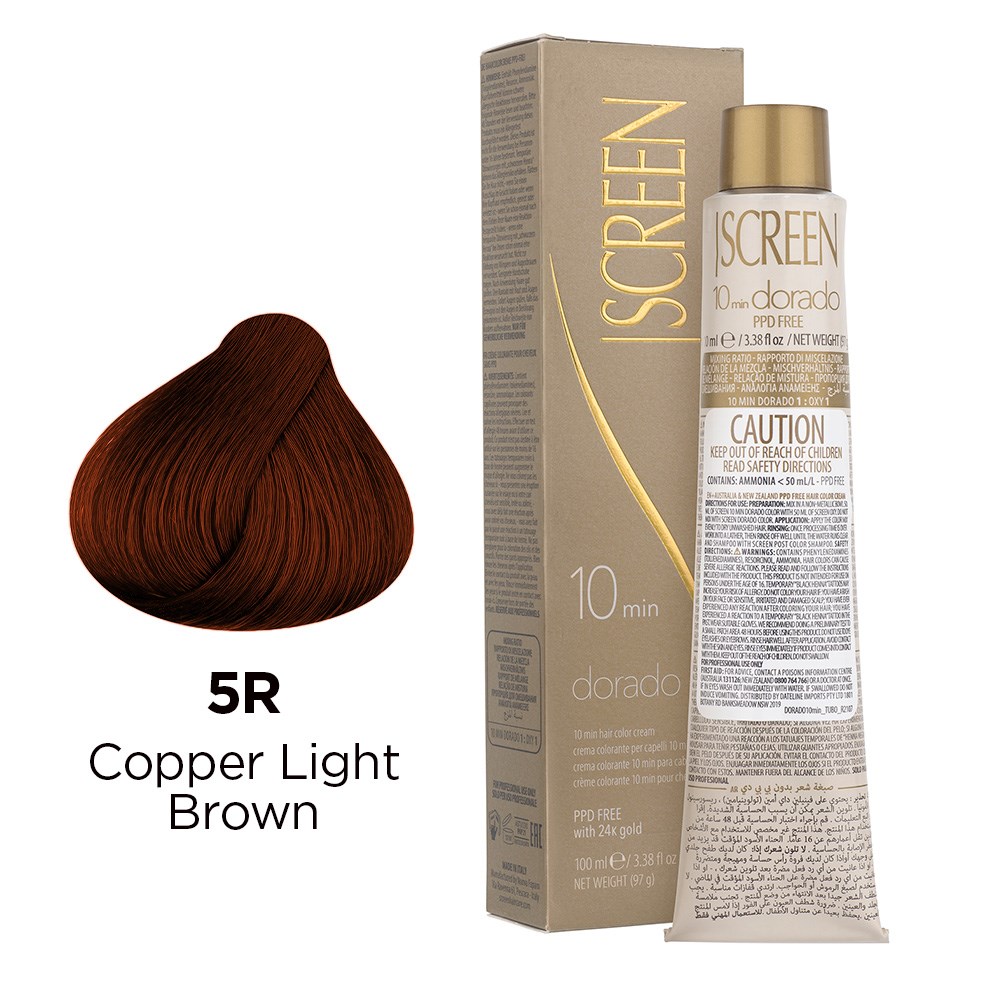 Ultra-fast, efficient and high performance, Screen 10 Min Dorado Hair Colour Cream 5R Copper Light Brown is a salon dream. With only 10 minutes processing time, this PPD-free and paraben-free colouring cream is ideal for root touch-ups, grey coverage and male clients desiring colour blending. Enriched with 24K gold for incredible light-reflecting results, vibrant shine and rich vibrancy. Maximum grey coverage and uniform, long-lasting results. Only 10 minutes to incredible colour with superb tonal richness! Elite colour created in Italy.