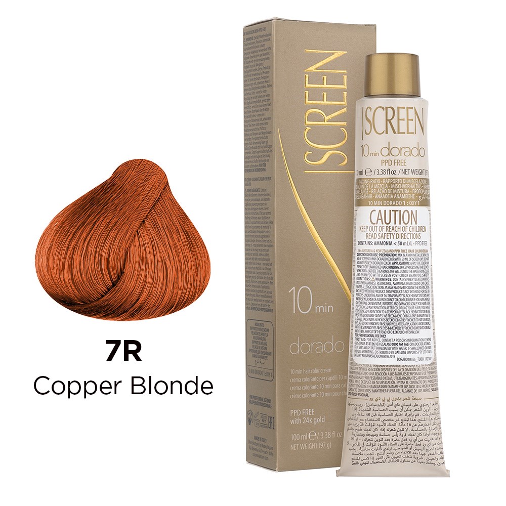 Ultra-fast, efficient and high performance, Screen 10 Min Dorado Hair Colour Cream 7R Copper Blonde is a salon dream. With only 10 minutes processing time, this PPD-free and paraben-free colouring cream is ideal for root touch-ups, grey coverage and male clients desiring colour blending. Enriched with 24K gold for incredible light-reflecting results, vibrant shine and rich vibrancy. Maximum grey coverage and uniform, long-lasting results. Only 10 minutes to incredible colour with superb tonal richness! Elite colour created in Italy.
