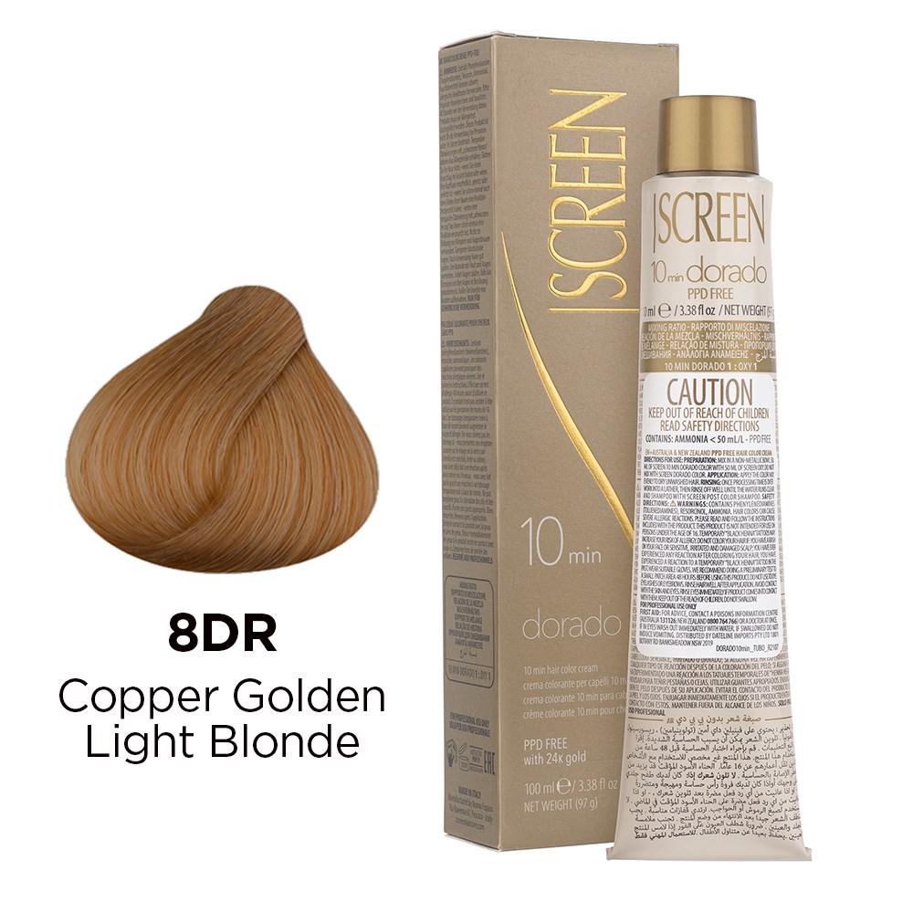 Ultra-fast, efficient and high performance, Screen 10 Min Dorado Hair Colour Cream 8DR Copper Golden Light Blonde is a salon dream. With only 10 minutes processing time, this PPD-free and paraben-free colouring cream is ideal for root touch-ups, grey coverage and male clients desiring colour blending. Enriched with 24K gold for incredible light-reflecting results, vibrant shine and rich vibrancy. Maximum grey coverage and uniform, long-lasting results. Only 10 minutes to incredible colour with superb tonal richness! Elite colour created in Italy.