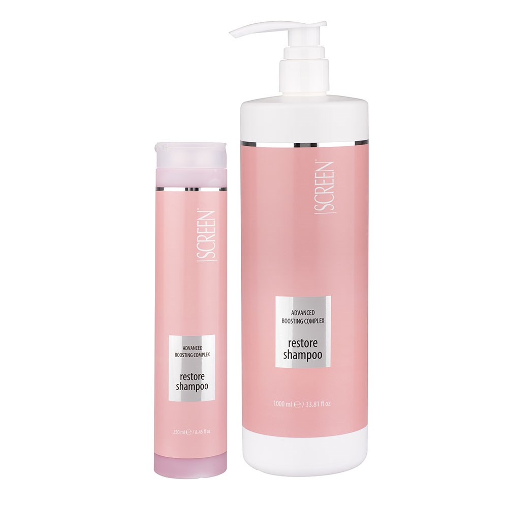 Lovers of beautiful hair never leave anything to chance. Screen Advance Boosting Complex (ABC) is an effective, sweetly scented range designed to enhance hair’s beauty, simply and instantly. Repair and regenerate damaged hair with Screen Advanced Boosting Complex Restore Shampoo 1L. Hydrolysed silk protein, hydrolysed wheat protein and pro-vitamin B5 treat stressed and chemically damaged hair. This repair shampoo is infused with a flowery, fruity scent to stimulate the senses while you gently cleanse. Made in Italy.