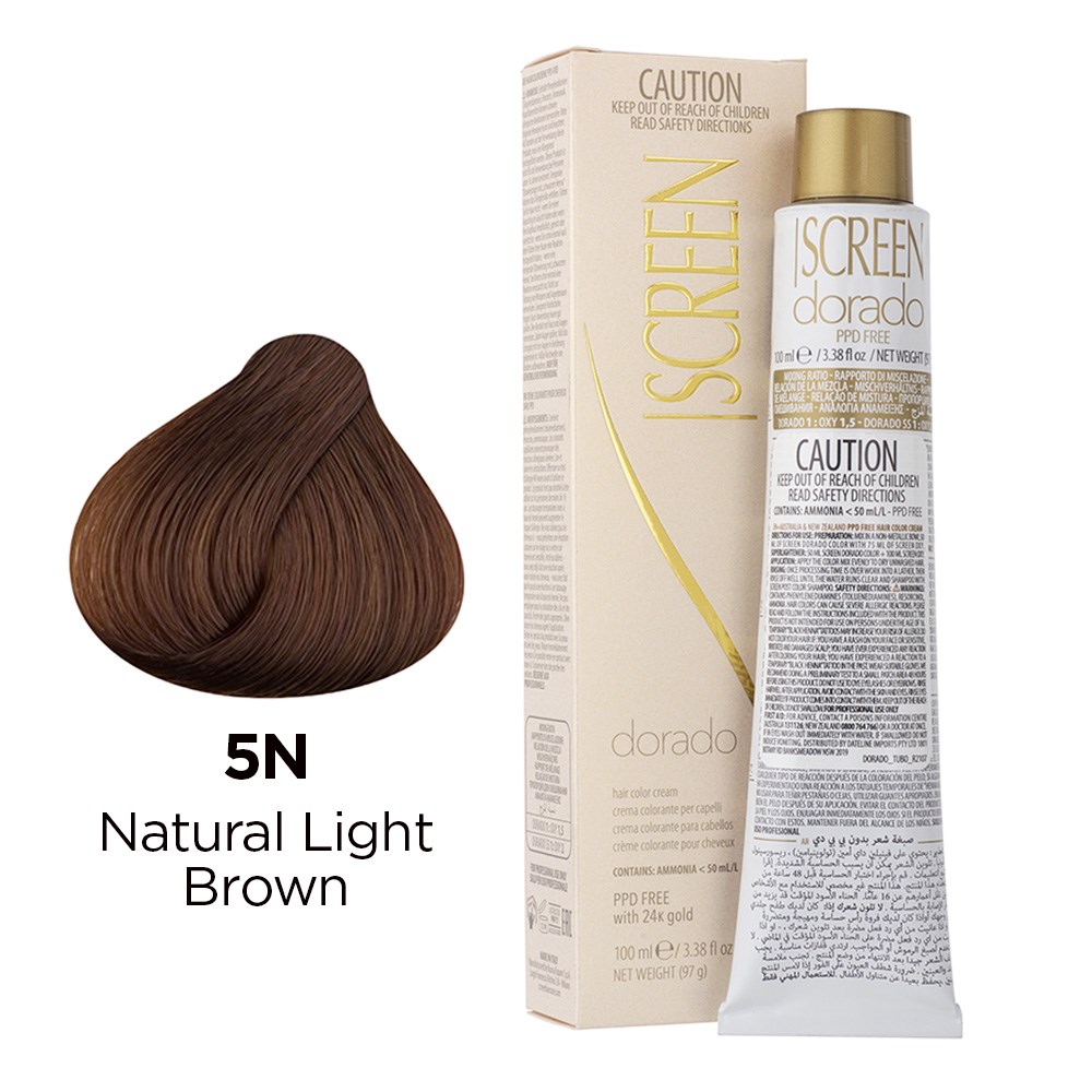 Precious cream colour with unique tonal richness. Developed in a wide range of colours, Screen Dorado Hair Colour Cream 5N Natural Light Brown is the culmination of advanced technology, research and continuous testing. This permanent hair colouring cream is PPD-free and enriched with 24K gold for results which are truly incredible. Microparticles of gold reflect light, multiplying the brilliance of colour. Colour is intensely rich and exceptionally long-lasting. Maximum grey coverage and balanced, uniform results. Elite colour created in Italy.