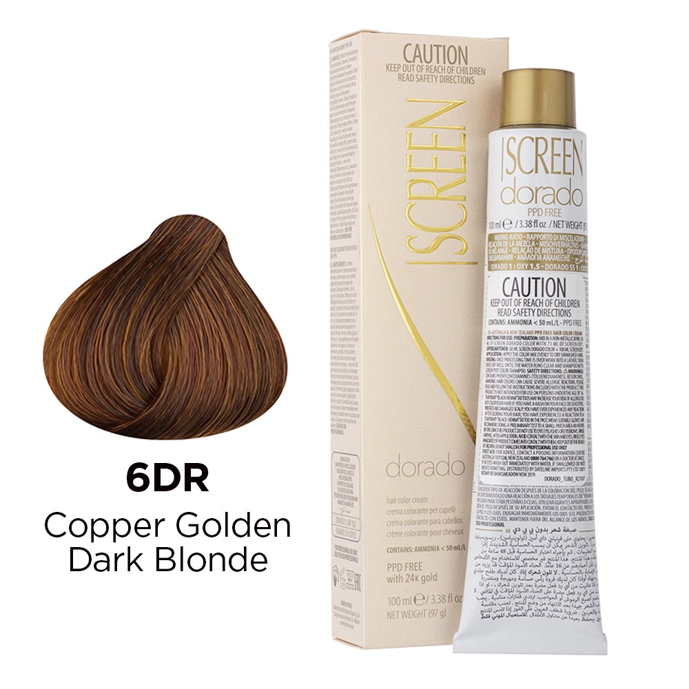 Precious cream colour with unique tonal richness. Developed in a wide range of colours, Screen Dorado Hair Colour Cream 6DR Copper Golden Dark Blonde is the culmination of advanced technology, research and continuous testing. This hair colouring cream is PPD-free and enriched with 24K gold for results which are truly incredible. Microparticles of gold reflect light, multiplying the brilliance of colour. Colour is intensely rich and exceptionally long-lasting. Maximum grey coverage and balanced, uniform results. Elite colour created in Italy.