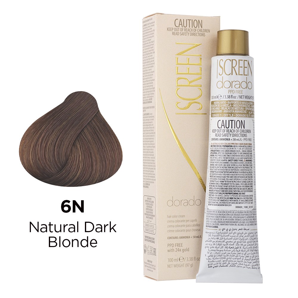 Precious cream colour with unique tonal richness. Developed in a wide range of colours, Screen Dorado Hair Colour Cream 6N Natural Dark Blonde is the culmination of advanced technology, research and continuous testing. This permanent hair colouring cream is PPD-free and enriched with 24K gold for results which are truly incredible. Microparticles of gold reflect light, multiplying the brilliance of colour. Colour is intensely rich and exceptionally long-lasting. Maximum grey coverage and balanced, uniform results. Elite colour created in Italy.