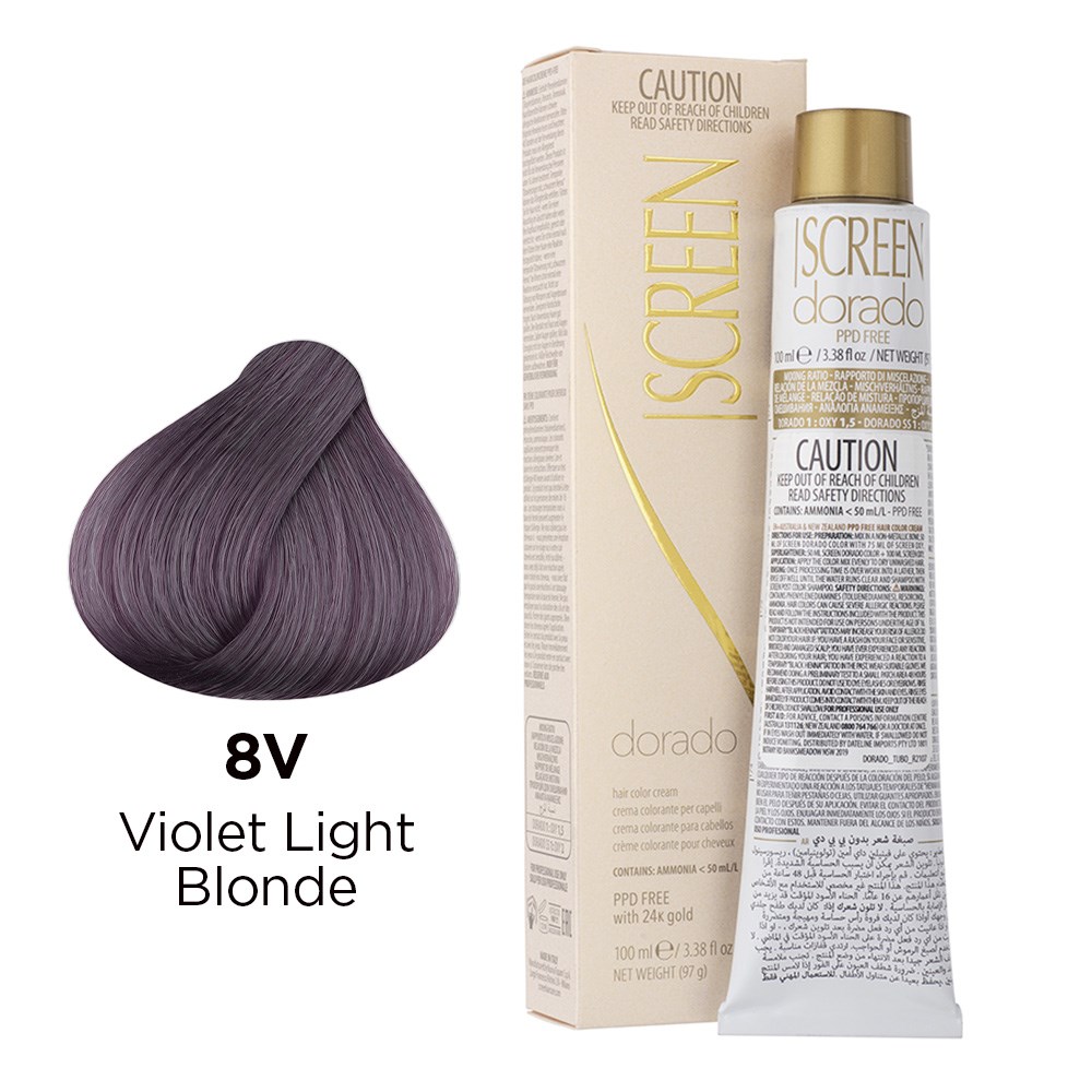 Precious cream colour with unique tonal richness. Developed in a wide range of colours, Screen Dorado Hair Colour Cream 8V Violet Light Blonde is the culmination of advanced technology, research and continuous testing. This hair colouring cream is PPD-free and enriched with 24K gold for results which are truly incredible. Microparticles of gold reflect light, multiplying the brilliance of colour. Colour is intensely rich and exceptionally long-lasting. Maximum grey coverage and balanced, uniform results. Elite colour created in Italy.