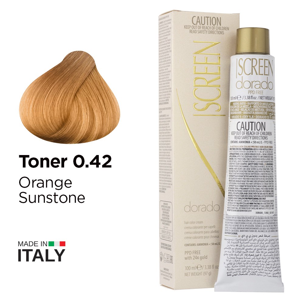 Inspired by the changing colours of the Grand Canyon over the course of the day, Screen has created the beautiful Colorado Twinkle collection. Screen Dorado Hair Colour Toner 0.42 Orange Sunstone is a precious hair cream with unique tonal richness. This hair colouring cream is PPD-free and enriched with 24K gold for results which are truly incredible. Microparticles of gold reflect light, multiplying the brilliance of colour. Colour is intensely rich and exceptionally long-lasting. Colour is for toning and does not affect the base colour. Ethereal and sophisticated colour created in Italy.