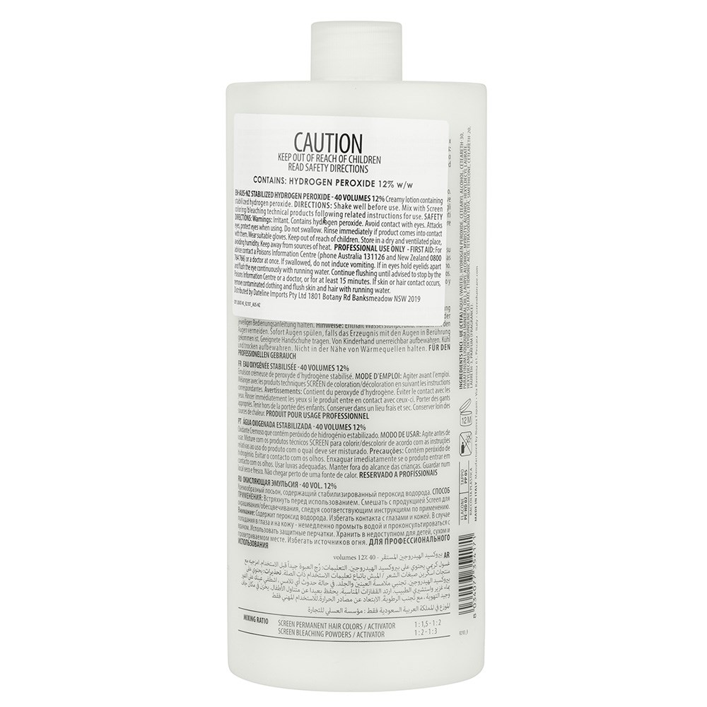 For the most even and consistent results during the colouring and bleaching process, choose Screen Oxy Liquid 40 Volume Developer. Made in Italy to the highest standards, this oxidant emulsion contains 12% stabilised hydrogen peroxide . Designed to be mixed with Screen’s elite colouring and bleaching products. Screen has swept across 68 countries, championed by hair artists who love the advanced ingredients and gorgeous results.
