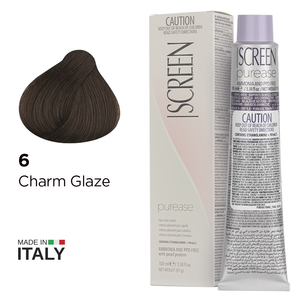 Created from the most advanced research, Screen Purease Hair Colour Cream 6 Charm Glaze is PPD-free and ammonia-free colouring cream enriched with strengthening pearl protein. Easy and quick application, a nuanced collection of hues and precious ingredients for brilliant shine make Screen Purease Hair Colour Cream a complete colouring system, suitable for satisfying the most creative of desires. Maximum grey coverage, long-lasting and outstandingly uniform results. Elite colour made in Italy.