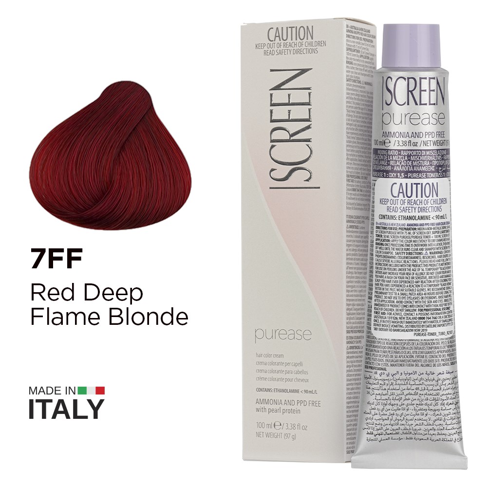 Created from the most advanced research, Screen Purease Hair Colour Cream 7FF Red Deep Flame Blonde is PPD-free and ammonia-free colouring cream enriched with strengthening pearl protein. Easy and quick application, a nuanced collection of hues and precious ingredients for brilliant shine make Screen Purease Hair Colour Cream a complete colouring system, suitable for satisfying the most creative of desires. Maximum grey coverage, long-lasting and outstandingly uniform results. Elite colour made in Italy.
