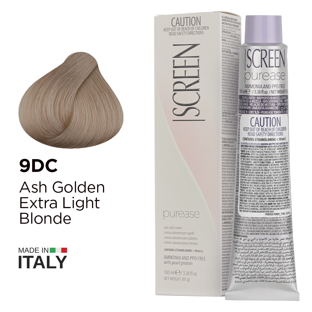 Created from the most advanced research, Screen Purease Hair Colour Cream 9DC Ash Golden Extra Light Blonde is PPD-free and ammonia-free colouring cream enriched with strengthening pearl protein. Easy and quick application, a nuanced collection of hues and precious ingredients for brilliant shine make Screen Purease Hair Colour Cream a complete colouring system, suitable for satisfying the most creative of desires. Maximum grey coverage, long-lasting and outstandingly uniform results. Elite colour made in Italy.