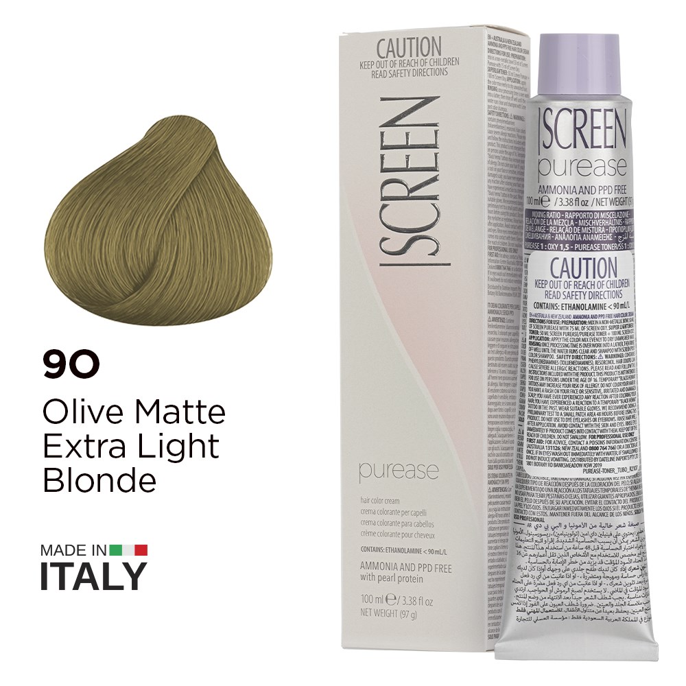 Created from the most advanced research, Screen Purease Hair Colour Cream 9O Olive Matte Extra Light Blonde is PPD-free and ammonia-free colouring cream enriched with strengthening pearl protein. Easy and quick application, a nuanced collection of hues and precious ingredients for brilliant shine make Screen Purease Hair Colour Cream a complete colouring system, suitable for satisfying the most creative of desires. Maximum grey coverage, long-lasting and outstandingly uniform results. Elite colour made in Italy.