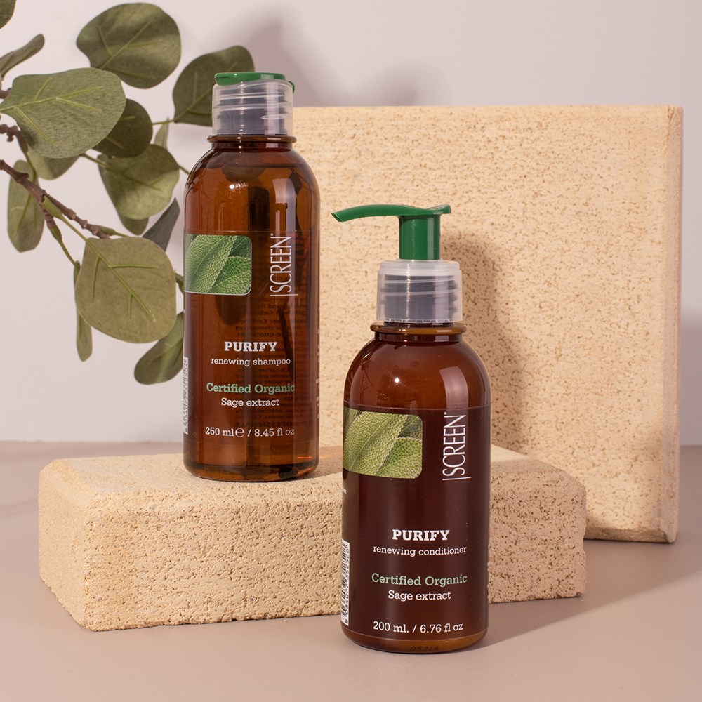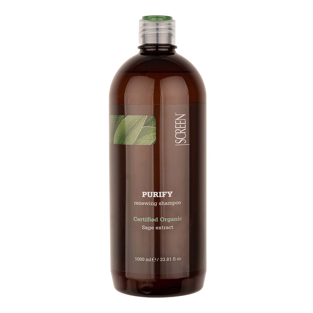 Organic ingredients for the maximum expression of purity. Screen Purest Purify Renewing Shampoo 1L is clean beauty made in Italy. Formulated with certified organic sage extract, this purifying shampoo gently nourishes and deeply cleanses scalp and hair. Sage extract is known for its purifying power, as well as its refreshing scent. SLS-free and paraben-free, this renewing shampoo is suitable for daily use. Naturally derived, non-genetically modified ingredients in a colourant-free formula for vitality and shine renewal.