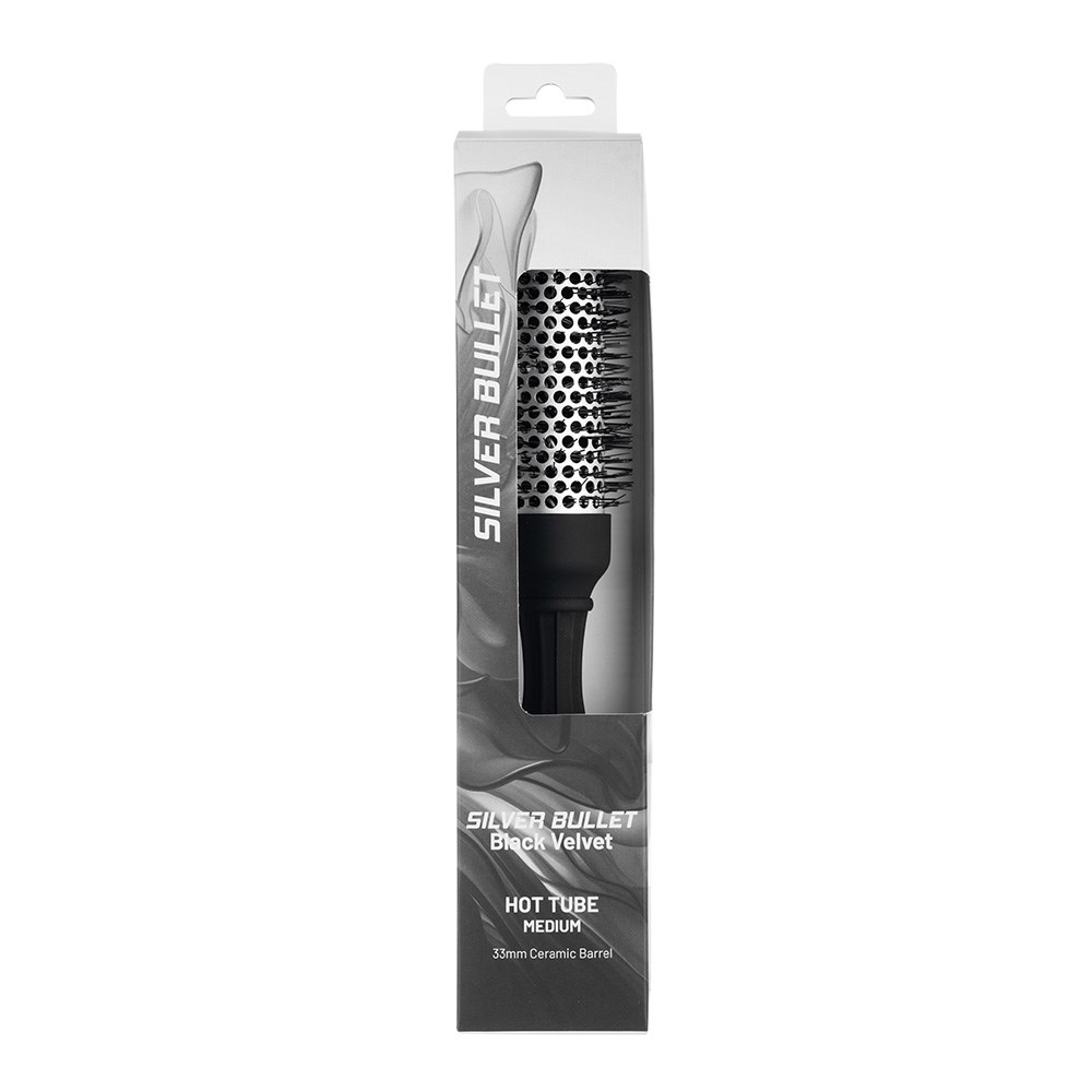 Create hair as smooth and soft as velvet with Silver Bullet Black Velvet Hot Tube Hair Brushes. A hollow, ceramic barrel fights frizz, allowing air to circulate underneath hair sections for fast, thermal styling and a smooth, shiny finish. Densely clustered nylon bristles provide perfect the tension for a smoother, sleeker result. the ergonomic, lightweight handle affords comfort and control, designed for extended salon use. Luxurious results with ease from Silver Bullet!
