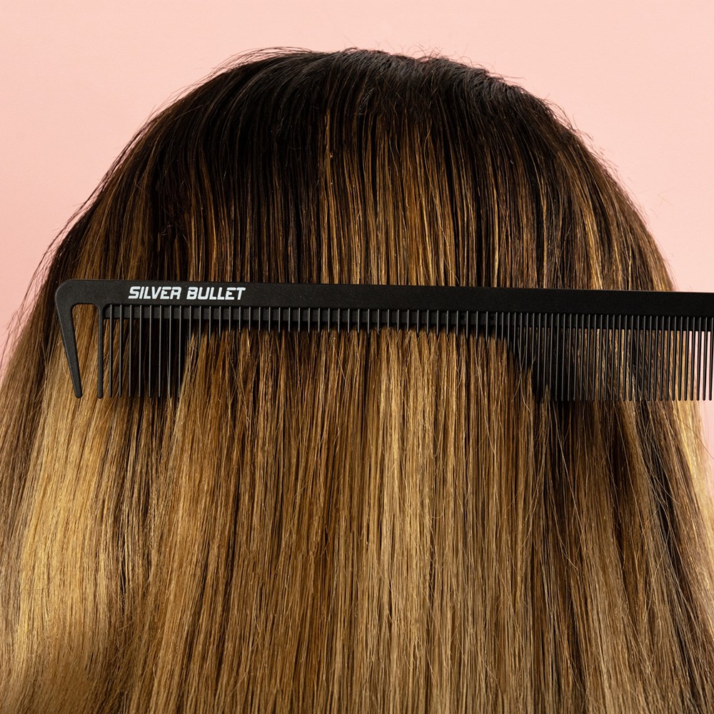 Silver Bullet Carbon. Strong. Resistant. Super-smooth. Silver Bullet Carbon Cutting Comb is made from carbon fibre and unconditionally guaranteed against breakage. Super-smooth teeth effortlessly glide through all hair types. Heat resistant and perfect for blow-drying. Ideal for use with chemicals. This 22.7cm comb features a dual teeth design for versatility in cutting different hair types and textures.