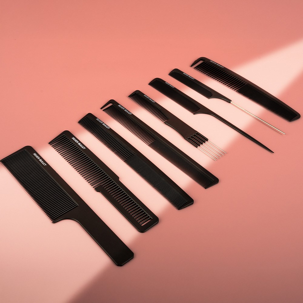 Silver Bullet Carbon. Strong. Resistant. Super-smooth. Silver Bullet Carbon Metal Tail Comb is made from carbon fibre and unconditionally guaranteed against breakage. Super-smooth teeth effortlessly glide through all hair types. Heat resistant. Ideal for use with chemicals. This 22.1cm comb is best suited to precision styling, parting and sectioning hair. The metal pin tail is durable and long-lasting. Use during foiling and highlighting or for creating updos and braiding.