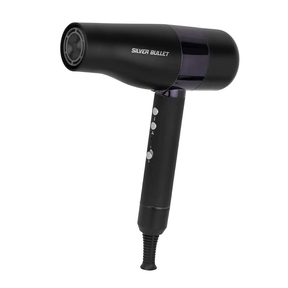 The Evolution is here. Ultra-high performance, lightweight and compact. Silver Bullet Evolution Professional Hair Dryer is the humble hair dryer made extraordinary. Exceptional power and speed with a super-fast BLDC 110,000 rpm motor. Blow-dry faster and better than ever before. 3 speed and 3 heat settings for all hair types. Clever auto clean function reverses motor to clean rear filter. Includes two magnetic nozzles: wide and regular.