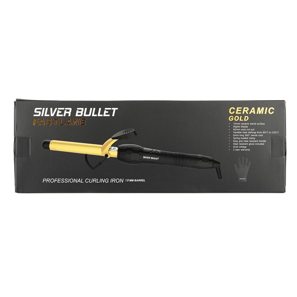 The Silver Bullet Gold Ceramic 19mm Curling Iron heats up instantly for super shiny, longer lasting curls. Ceramic technology locks style in place and smooths the hair cuticle, ensuring your luscious curls last. Create smooth ringlets with Silver Bullet Gold Ceramic 19mm Curling Iron. To switch on, hold the on button down for 5 seconds.