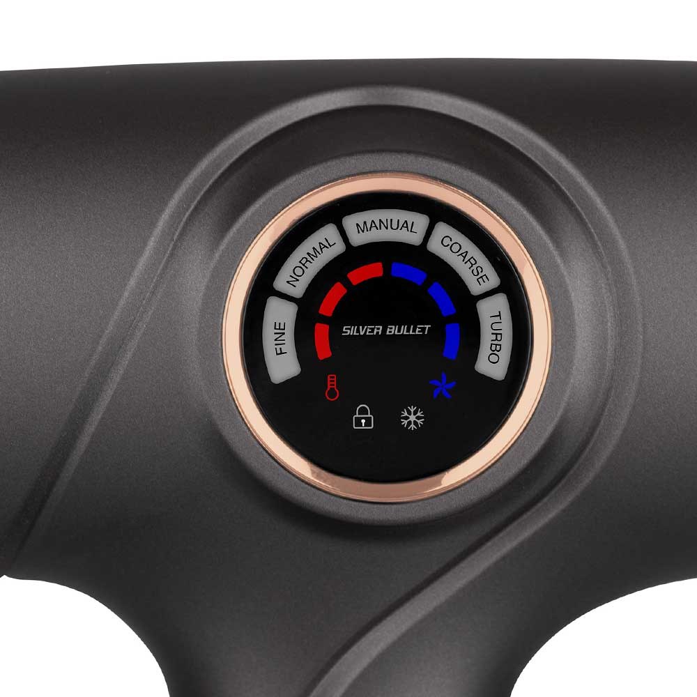 Ultra-powerful, super lightweight and digital. Fly high on futuristic performance with Silver Bullet JetLiner Hair Dryer. The most advanced technology is here. Incredible 105,000 rpm, 1800 watt, brushless DC motor. Five dial-in modes: fine, normal, coarse, manual and turbo boost, ensuring a setting for every hair type and every styling desire. Manual mode includes 3 speed/3 heat settings, plus there’s also a cool shot function. Ionic generator for silky smooth, shiny and frizz-free hair. Super lightweight at only 348g. With sleek, streamlined design, Silver Bullet JetLiner Hair Dryer helps creativity take flight.