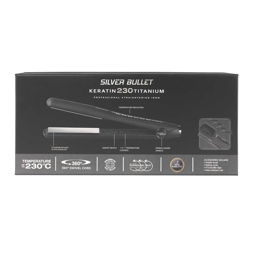 Take performance to the next level with Silver Bullet Keratin 230 Titanium Hair Straightener. If you struggle with straightening and find your average flat iron isn’t up to the task, struggle no more. Keratin 230 Titanium Straightener will tame unruly, thick or coarse hair. Providing heat up to 230°C, this straightener is an absolute prerequisite for styling even the most unmanageable hair