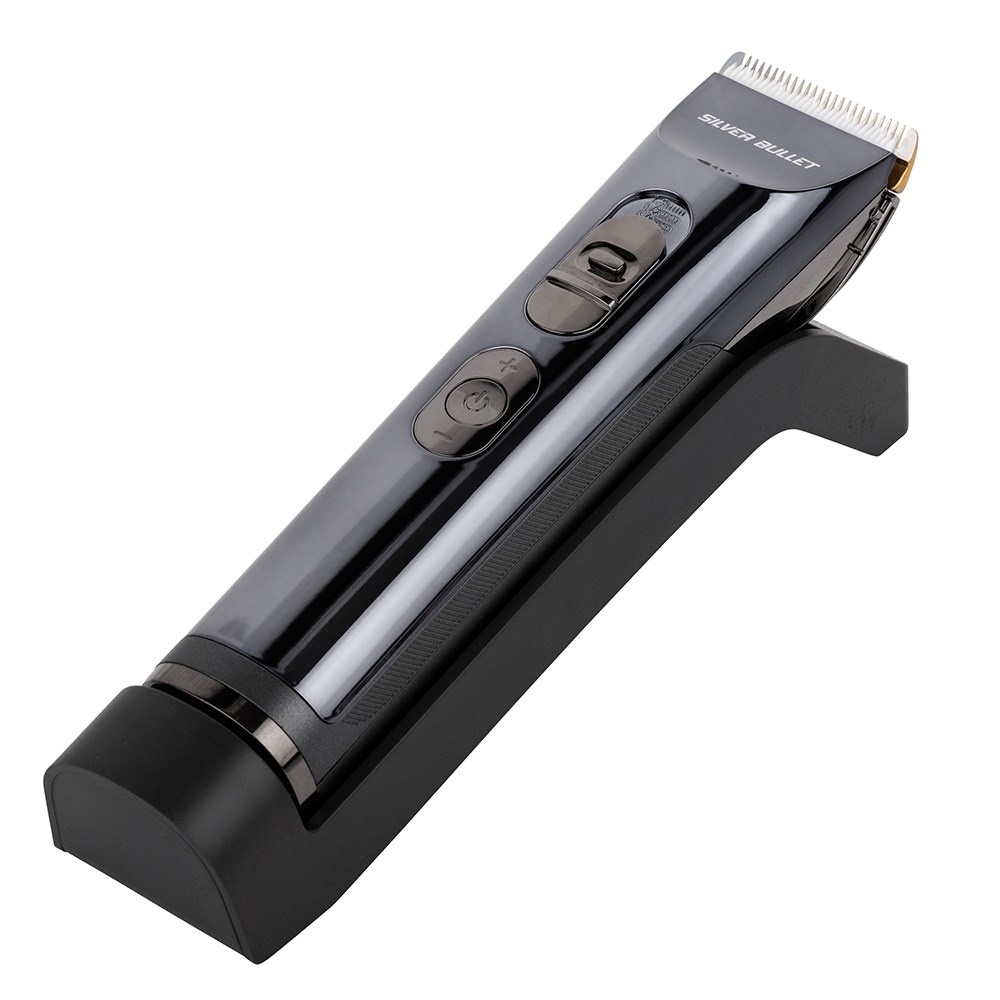 Lay back and enjoy the power of Silver Bullet Layback Hair Clipper. With layback charging base, this cord/cordless clipper sets an ultra-fast pace with three blade speeds of 5,500-7,500 rpm. Layback? Yes. Laidback? No. The lithium-ion battery delivers 4 hours cordless runtime, but only 2 hours charging time courtesy of the fast layback charger. Superior stainless steel base blade and ceramic cutting blade for a closer, faster, better cutting experience.