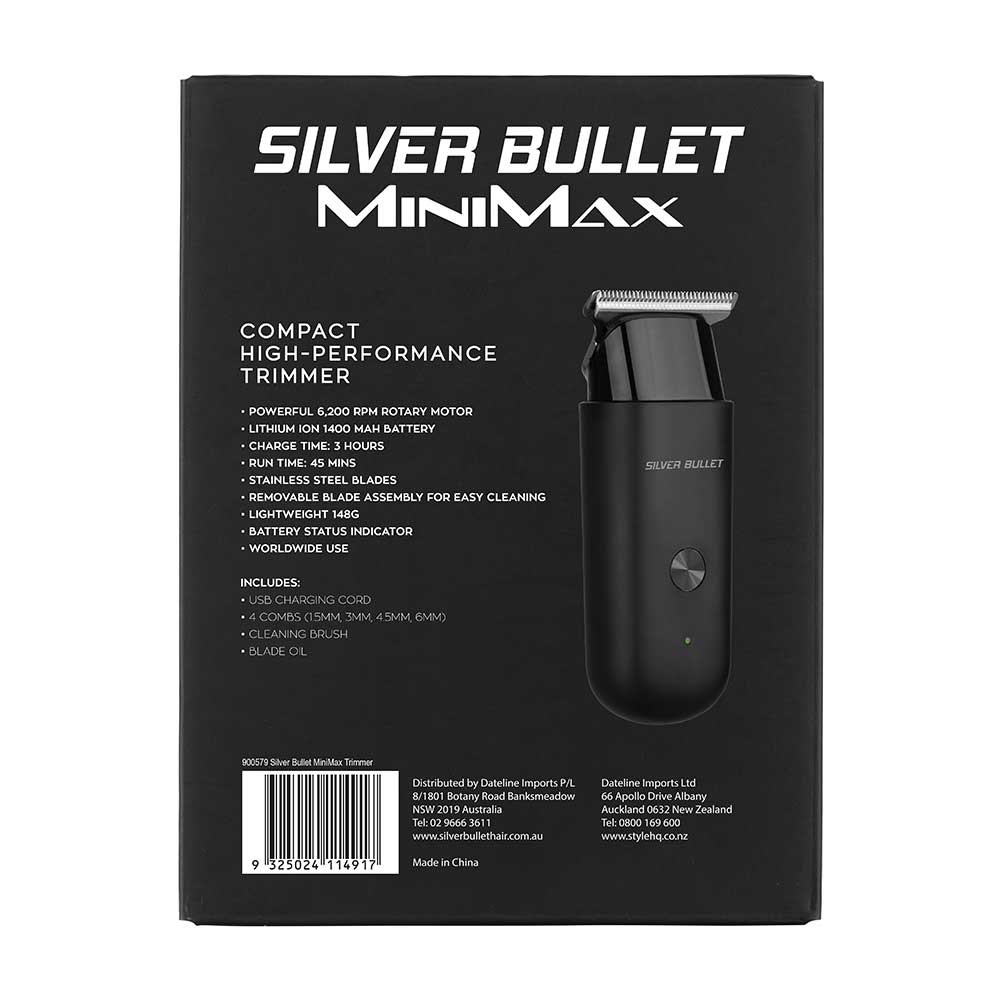 New favourite travel companion. Silver Bullet MiniMax Hair Trimmer is a mini-sized hair trimmer with maximum performance. Designed to fit in your palm, this trimmer features a powerful 6,200 rpm rotary motor and stainless steel blades for a closer, faster, better cut. Lithium ion 1400 mAh battery allows for 45 minutes of convenient cordless runtime, while USB charging lets you charge anywhere, even at your desk. Super lightweight at only 148 grams, the MiniMax is perfectly suited to travel, home or your work bag for quick clean-up on-the-go. Facial hair trimming made ultra-convenient!