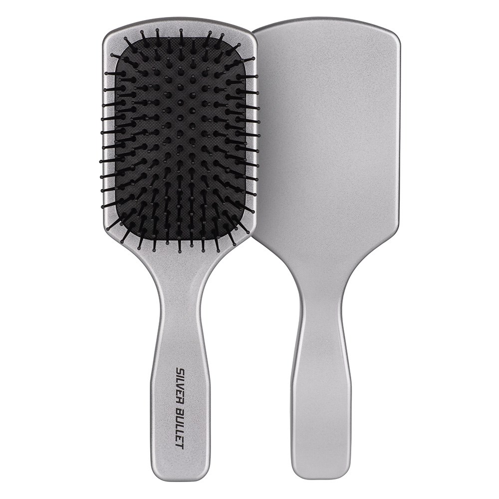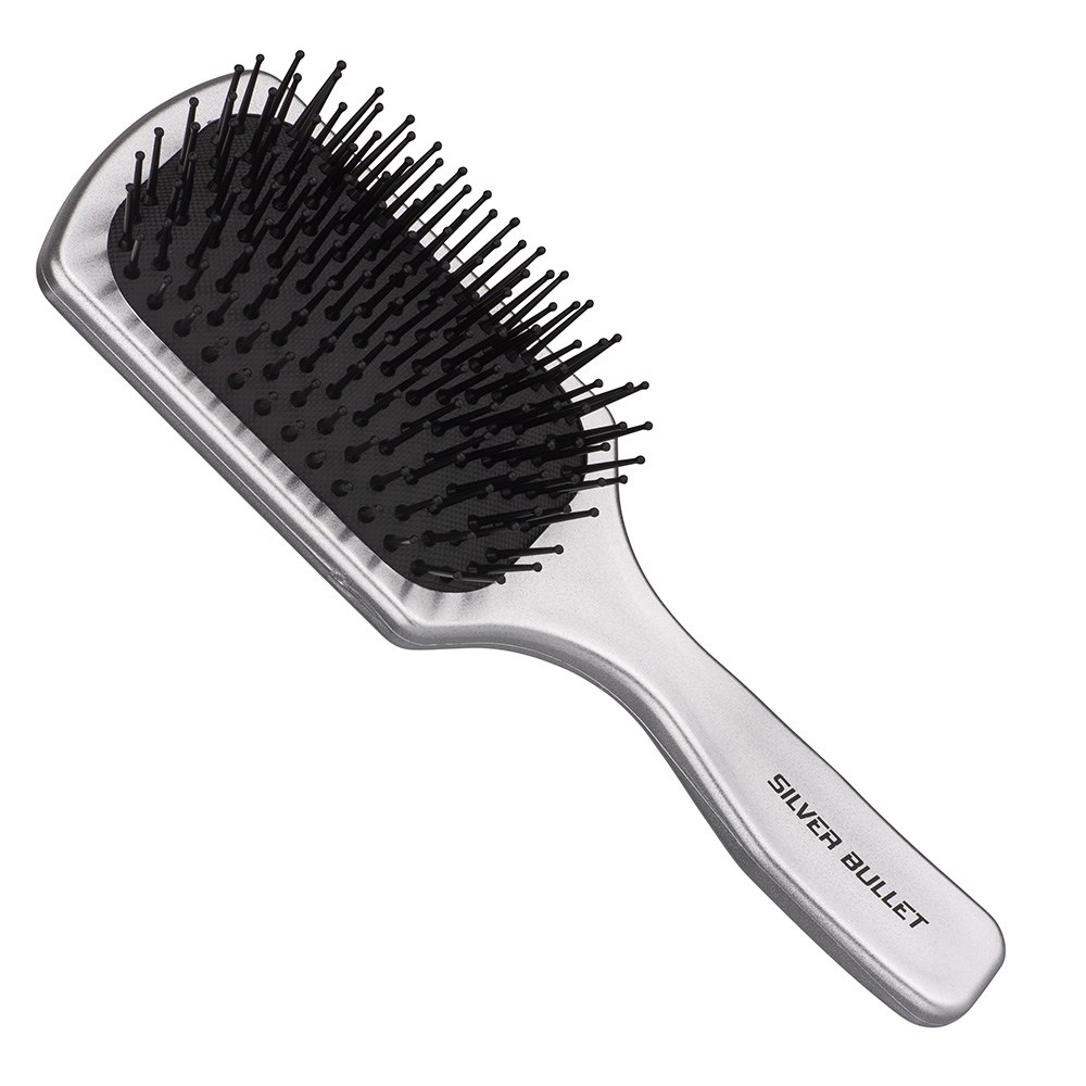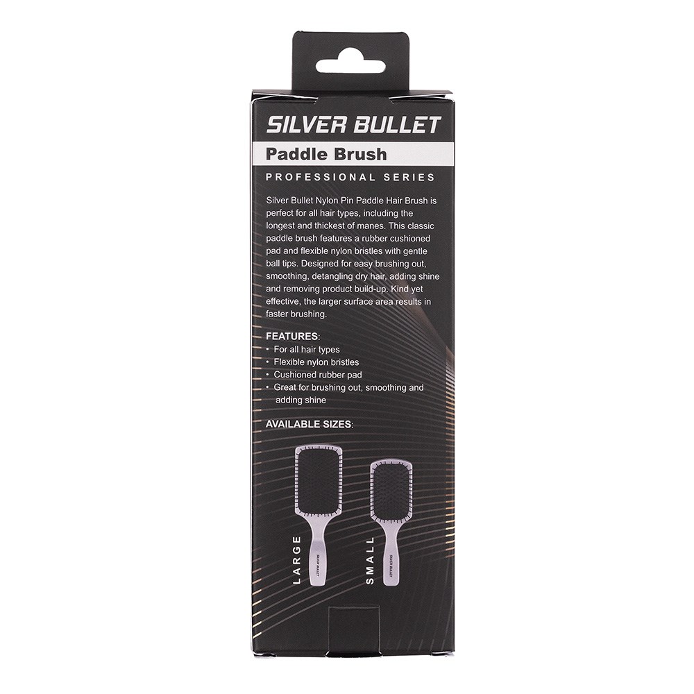 This is the quintessential paddle brush. Silver Bullet Nylon Pin Paddle Hair Brush Small is perfect for all hair types, including the longest and thickest of manes. This classic paddle hair brush features a rubber cushioned pad and flexible nylon bristles with gentle ball tips. Designed for easy brushing out, smoothing, detangling dry hair, adding shine and removing product build-up. Kind yet effective, the larger surface area results in faster brushing.