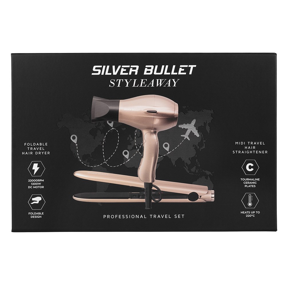 Ready, set, go! Professional styling on-the-go with Silver Bullet Styleaway Hair Dryer and Straightener Travel Set. Silver Bullet Runway Foldable Mini Travel Hair Dryer packs power with 22,000 RPM 1200W DC motor, two heat/speed settings and 12 m/s air speed. Silver Bullet Midi Travel Hair Straightener features tourmaline ceramic coated plates and heat to 220°C. Both compact tools are dual voltage for worldwide use. The hotter, faster, better travel set!