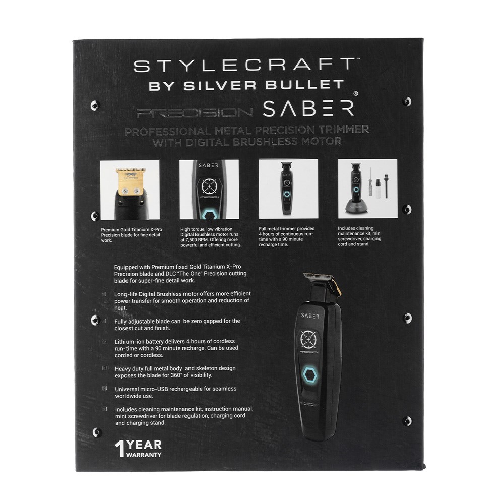Back in black. StyleCraft by Silver Bullet Saber Hair Trimmer Black is a hero trimmer with all-metal body, skeleton design and 360° exposed blade. High torque, long-life, low vibration, digital brushless motor runs at 7,500 rpm. Black Diamond “The One” deep tooth cutting blade for fast, smooth cutting (no pulling!) and Gold Titanium X-Pro wide fixed blade for sharper lines. Fully adjustable blade can be zero gapped for the closest cut and finish. Lithium ion battery delivers four hours of convenient cordless runtime with 90 minute recharge. Universal micro USB charging.