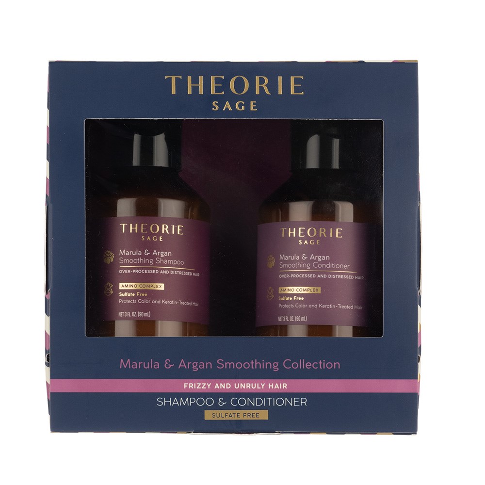 Rejuvenate and moisturise hair with a dual-botanical blend of marula oil and argan oil. Theorie Marula and Argan Travel Set is a smoothing and rejuvenating shampoo and conditioner for distressed and over-processed hair. Hair is infused with nutrient-rich argan, marula, sage and grapeseed oils. The blend of antioxidants and moisturising fatty acids, along with strengthening keratin, protects hair from breakage and restores shine to damaged, dehydrated locks.