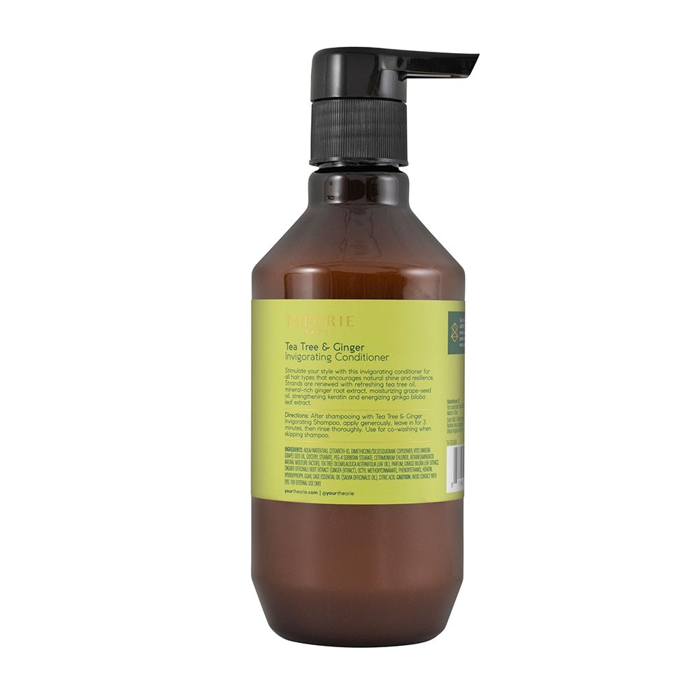 Enhance hairs natural shine and resilience with the Theorie Tea Tree and Ginger Conditioner. This stimulating and invigorating conditioner renews hair with refreshing tea tree oil, mineral-rich ginger root, moisturising grapeseed oil, strengthening keratin and energising gingko biloba. Amino Complex provides essential proteins and nutrients to strengthen and protect hair from root to tip. Designed for all hair types.