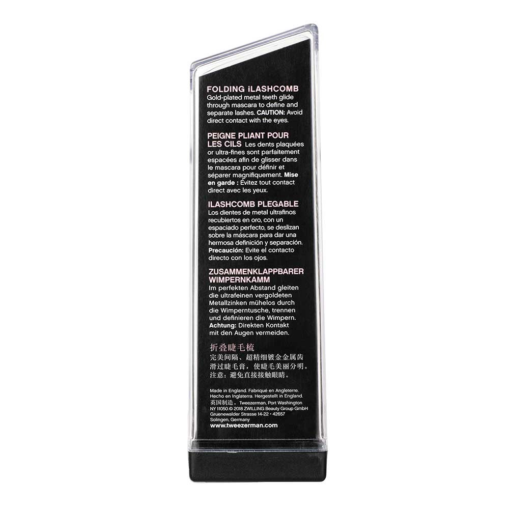 The Tweezerman Folding iLashcomb features perfectly spaced, gold-plated teeth which effortlessly glide through wet mascara for defined, evenly separated, and natural looking lashes. The teeth of the Tweezerman eyelash comb fold compactly into the handle for protection.